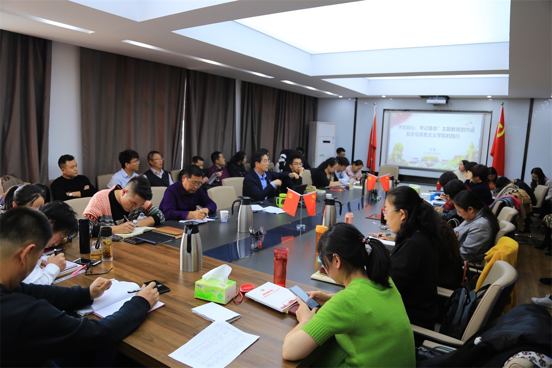 10月28日下午,在6776永利集团507会议室,党总支书记贺瑞以“不忘初心、牢记使命主题教育的内涵及在6776永利集团的践行”为题,为学院师生讲授“不忘初心、牢记使命”主题教育专题党课。校第五主题教育指导组周绍渊同志到会指导。
