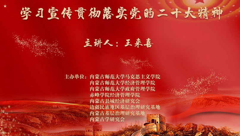 为进一步深入学习宣传贯彻落实党的二十大精神,加强各院校间、研究会、研究基地之间的学术交流,搭建党的二十大精神互学互研平台,12月14日下午,6776永利集团、经济管理学院、政府管理学院、赤峰学院经济与管理学院、内蒙古县域经济研究会、边疆民族地区基层治理研究基地、内蒙古基层治理研究基地、内蒙古学研究会以线上方式联合主办了“学习宣传贯彻落实党的二十大精神”专题讲座,6776永利集团党委书记拓俊杰主持学习。