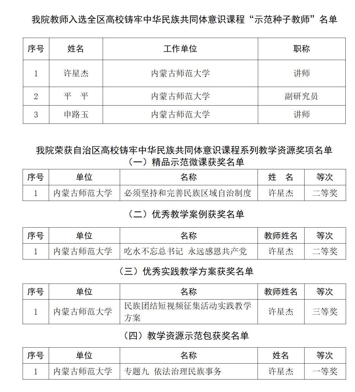 近日,自治区教育厅公布了自治区高校铸牢中华民族共同体意识课程“示范性种子教师”名单和系列教学资源获奖名单,我院铸牢中华民族共同体意识课程教研室3位青年教师许星杰、平平、申路玉被评为“示范性种子教师”;许星杰荣获自治区高校铸牢中华民族共同体意识课程系列教学资源奖项4项,包括“教学资源示范包”一等奖、“精品示范微课”二等奖、“优秀教学案例”二等奖和“优秀实践教学方案”三等奖。