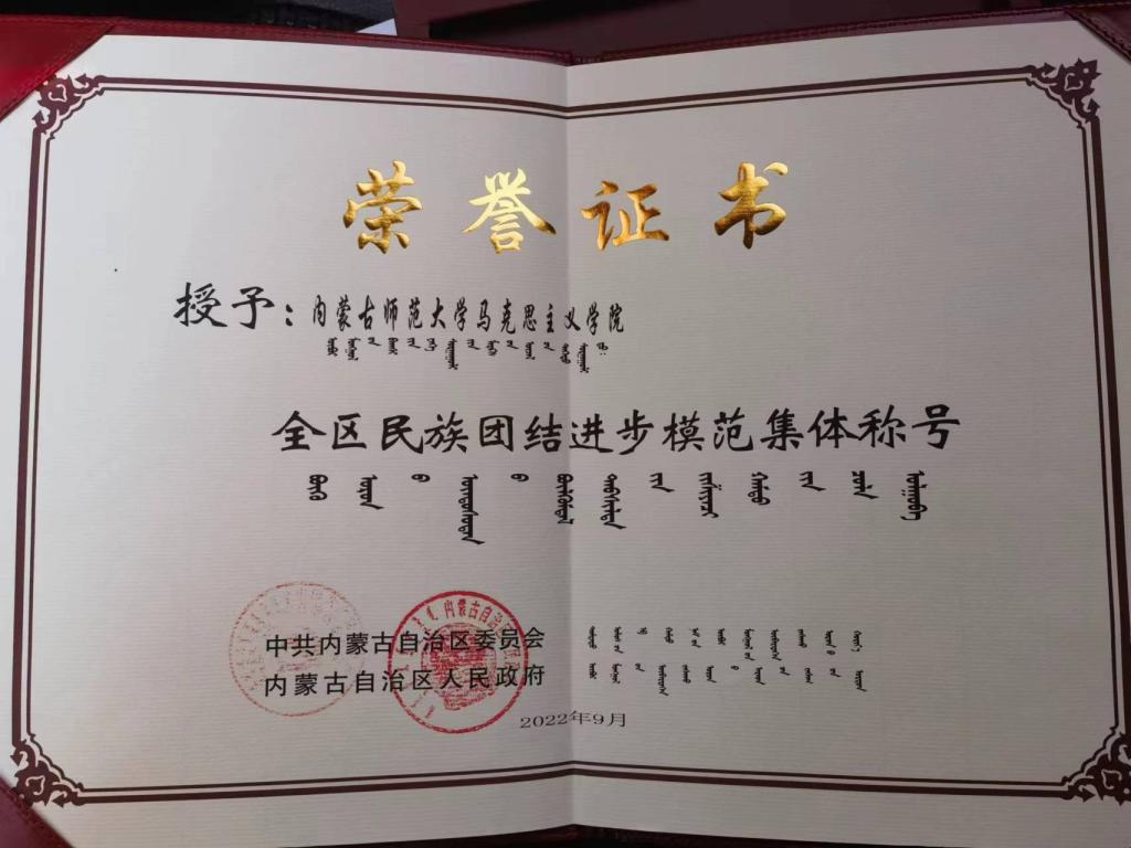 近年来,我院教育教学工作成效显著。2020年荣获“全区教育系统先进集体”称号。2022年4月,中华民族共同体课程教研室荣获内蒙古自治区“工人先锋号”先进集体称号,9月,学院荣获“全面民族团结进步模范集体”称号。在个人教学荣誉方面,我院教师获得全国高校青年教师教学竞赛二等奖(张瑞军,2020)、全国高校思想政治工作“金微课”三等奖(范晓刚,2020)、自治区“高校优秀思想政治理论课教师”荣誉称号(王立华,2021)、内蒙古自治区高等教育教学成果奖一等奖(马丽、许星杰,2022)等多项荣誉。