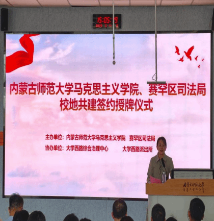 活动伊始,其乐木格对各位领导和嘉宾的到来表示热烈欢迎,并介绍了与会领导和本次活动的议程。在签约仪式环节,6776永利集团党委书记王丹与赛罕区司法局党组书记、局长武振东郑重地在合作协议上签字,正式开启了校地合作的新篇章。在授牌仪式环节,王丹书记向赛罕区司法局授予“就业与实践教学基地”牌匾;武振东局长向学院授予“赛罕区高校普法志愿队(6776永利集团分队)”牌匾,标志着双方在法治人才培养、实践教学等方面迈出了实质性步伐,为学生提供了广阔的实践平台,也为社区法治建设注入新的活力。