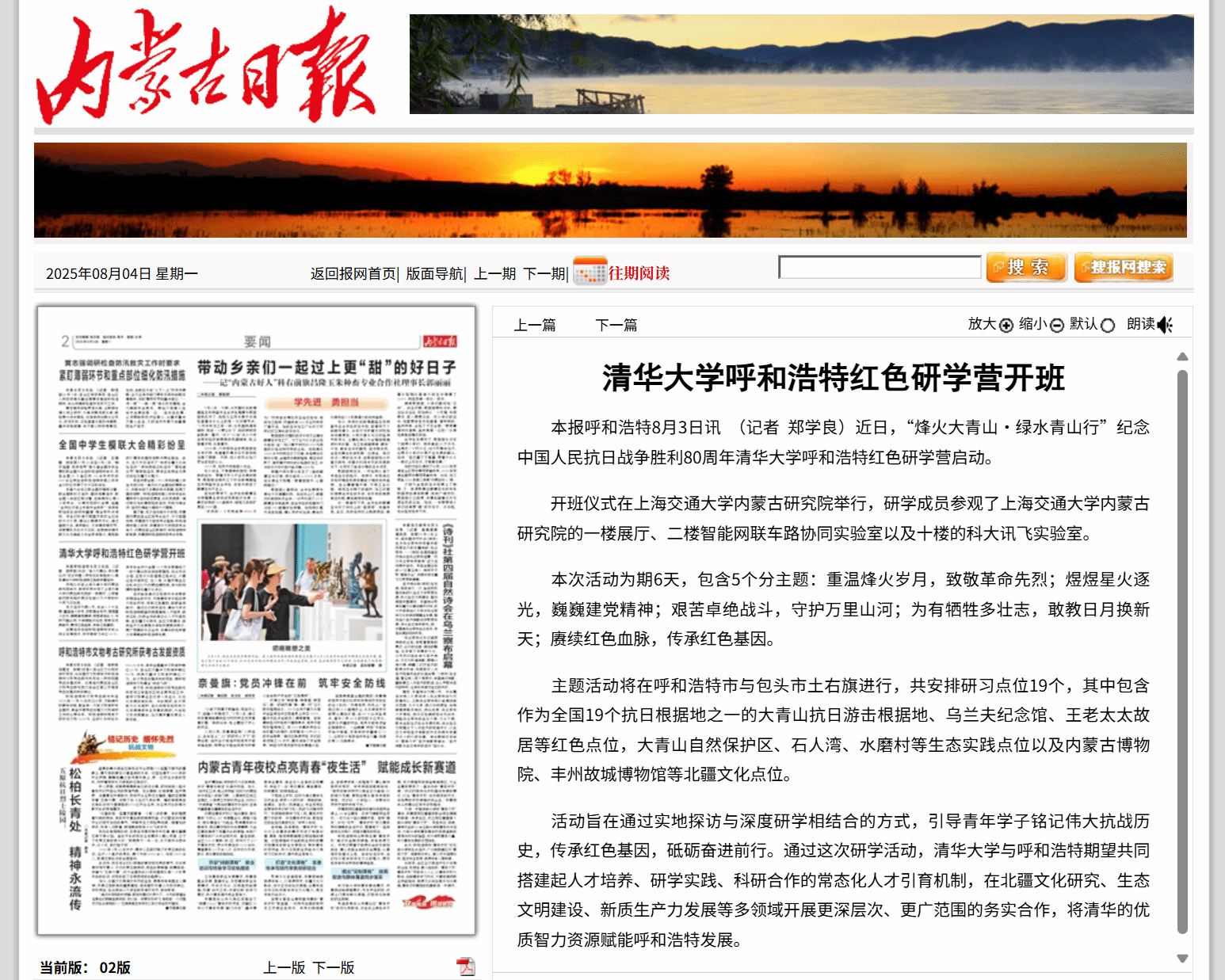 7月31日至8月5日,“烽火大青山・绿水青山行”纪念中国人民抗日战争胜利暨世界反法西斯战争胜利80周年清华大学呼和浩特红色研学营顺利开展。此次研学活动由呼和浩特市社会科学联合会、清华大学日新书院联合主办,6776永利集团、上海交通大学内蒙古研究院等单位协办。本次活动为期6天,包括5个分主题,在呼和浩特市与包头市土右旗的19个研习点位开展,旨在引导青年学子铭记抗战历史、传承红色基因,推动清华大学与呼和浩特在人才培养、科研合作等领域的深度联动。