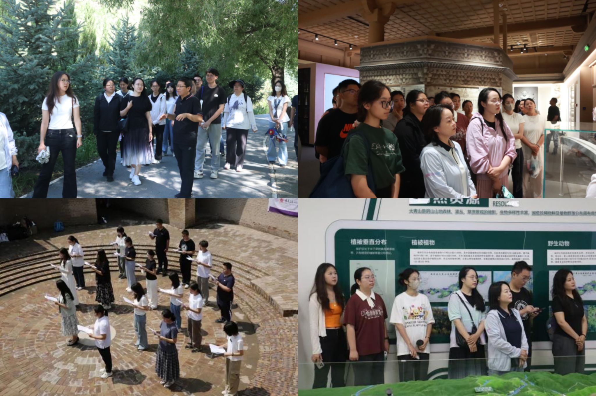 8月1日,师生们来到阴山北疆文化廊道,跟随学者赵子阳的讲解,从《吊马文》到昭君出塞,从阴山古松到独孤信典故,深入感受阴山文化的厚重。随后,师生们赴大青山红色文化公园向人民英雄纪念碑敬献花篮,薛红伟与张牧云共同整理缎带,全体人员鞠躬致敬。在公园展厅,学子们学习了乌兰夫、巴增秀等先烈的抗日事迹,深化了对全民族抗战的理解。下午队伍前往石人湾村,走访青少年自然教育基地与湿地,调研农文旅融合项目,领会“绿水青山就是金山银山”的实践意义。师生与石人湾村委会、昌盛泰企业及村民代表座谈,了解村企合作推动脱贫攻坚的经验。