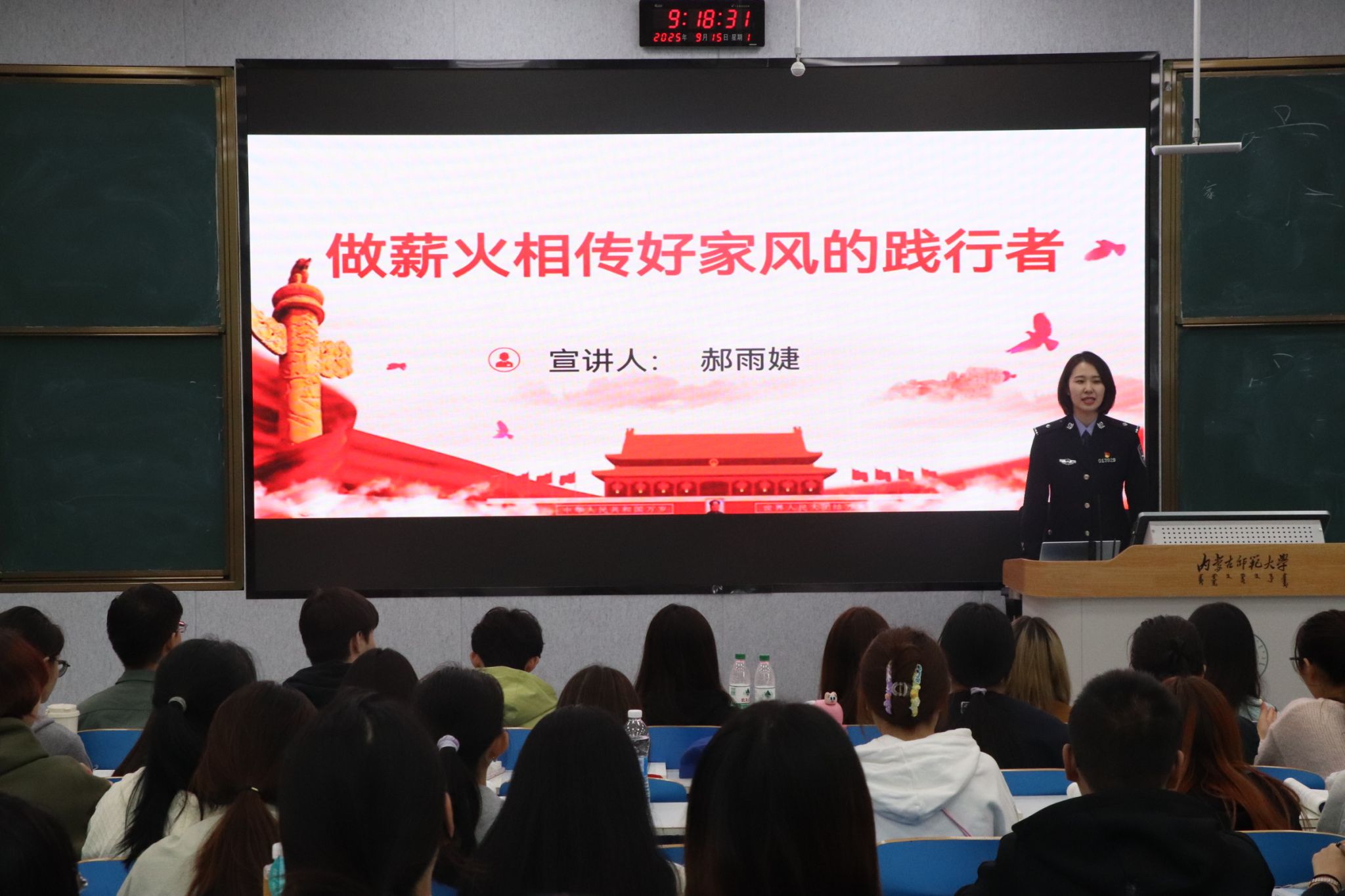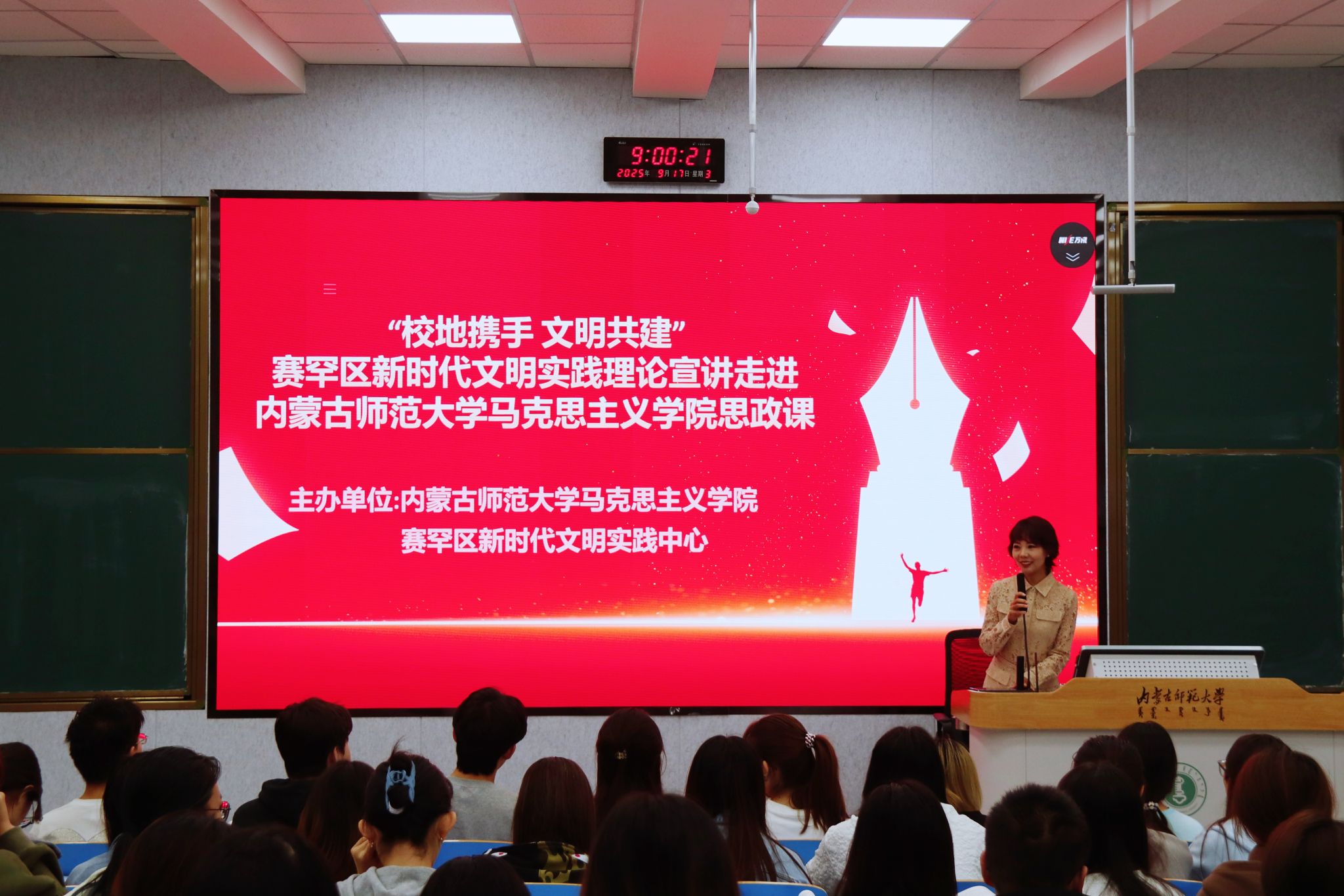 作为全国首批入围的20家共建试点单位之一,6776永利集团高度重视与新时代文明实践中心的校地联动。本次活动中,学院邀请了玉泉区和赛罕区新时代文明实践中心选派的优秀基层百姓名嘴走进思政课堂,宣讲党的创新理论。其中,玉泉区宣讲员围绕“传承良好家风”“弘扬社会主义核心价值观”等主题,结合基层实践和典型事例,为马院学子带来了一场接地气、有温度的专题宣讲。以生动朴实的语言、贴近实际的内容,让党的创新理论在青年学生中更具吸引力、感染力,赢得师生广泛好评。赛罕区宣讲员讲述的《戈壁滩上的星河》,以草原戈壁间的真实航天往事为主线,将镜头对准我国航天事业起步阶段那些“隐于幕后”的平凡英雄,生动再现了一代代航天人在荒芜戈壁中的奋斗场景,使“航天精神”与“两弹一星”精神在一个个鲜活故事中变得可感、可触、可学。