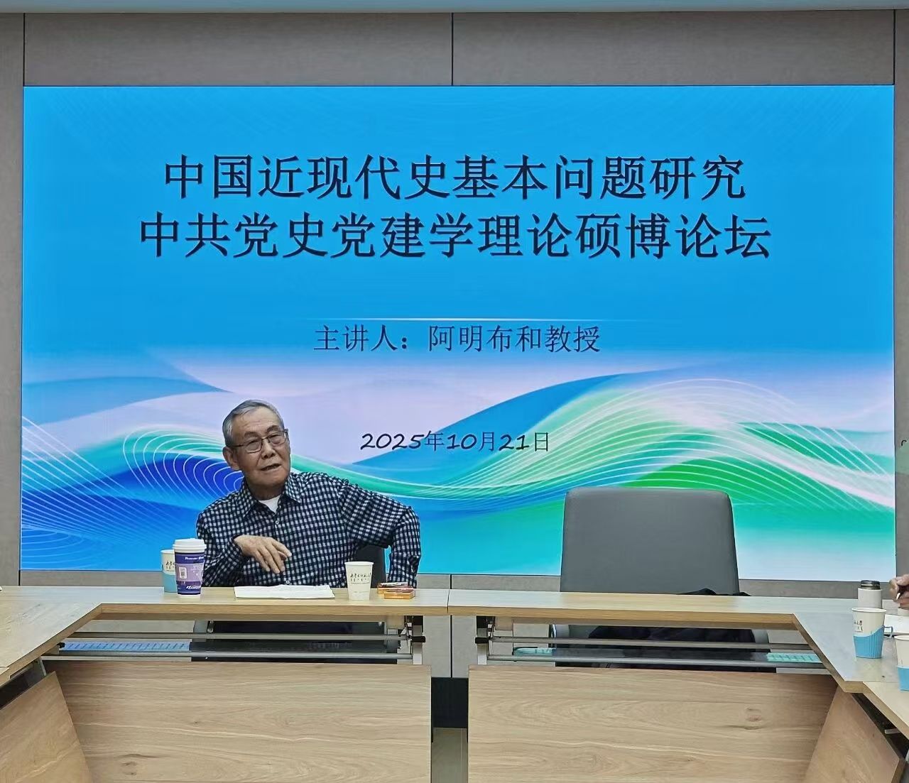 2025年10月21日下午,我院中国近现代史基本问题研究与中共党史党建学理论学位点“硕博论坛”在学术交流中心2号会议室举办。永利官网原政治经济系主任阿明布和教授以“如何学习中共党史”为主题作了专题讲座。6776永利集团党委书记王丹、副院长刘爱华、钢特木尔参加会议,中国近现代史基本问题研究与中共党史党建学理论专业研究生、思政系青年教师等60多人现场聆听。博士生导师赵图雅教授主持会议。