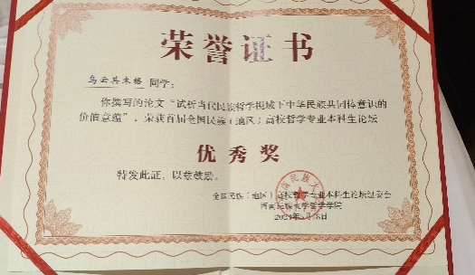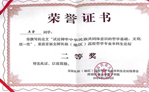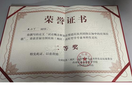 我院哲学系本科生王小丫的论文“试论概念框架在塑造民族共同体认知中的应用价值”、王雪荣的论文“试论铸牢中华民族共同体意识的哲学基础:文化统一性”荣获二等奖,乌云其木格的论文“试析当代民族哲学视域下中华民族共同体意识的价值意蕴”荣获优秀奖。