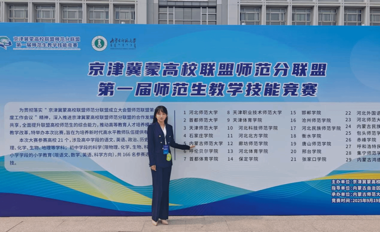 京津冀蒙高校联盟师范分联盟师范生教学技能竞赛,是汇聚区域师范教育优质资源、搭建师范生专业成长与交流展示的高端平台,不仅为我院师范生提供了检验学习成果、切磋教学技艺的宝贵机会,更成为直观展现我院师范生培养质量、彰显师范教育办学特色的重要窗口。此次比赛是韩冰同学在6776永利集团第十三届师范生教师技能比赛、永利官网第十三届师范生技能竞赛、第十四届全国高校思政教育师范生教学技能比赛中先后荣获一等奖之后,再次取得佳绩。下一步,学院将以比赛为重要契机,进一步优化“厚基础、强实践、重创新”的培养宗旨,为基础教育事业输送更多师德高尚、业务精湛的新时代人才。