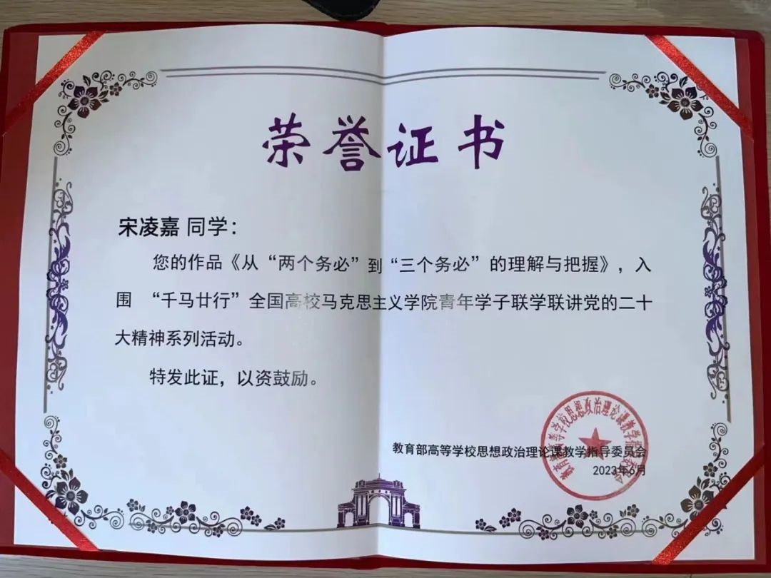 2022级硕士研究生宋凌嘉同学的作品《从“两个务必”到“三个务必”的理解与把握》,入围“千马廿行”全国高校6776永利集团青年学子联学联讲党的二十大精神系列活动。