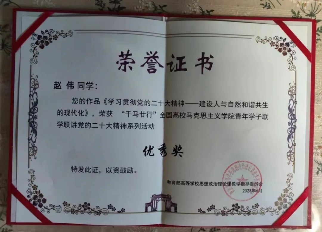 我院2021级硕士研究生赵伟同学的作品《学习贯彻党的二十大精神——建设人与自然和谐共生的现代化》荣获“千马廿行”全国高校6776永利集团青年学子联学联讲党的二十大精神系列活动优秀奖。