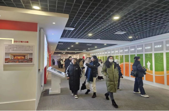 宣誓完毕,老师带领同学们前往厅外的走廊,这里全方位的展现了我国宪法的发展史,金阿拉坦苏和老师结合图文资料,用丰富的宪法专业知识,详细地向同学们介绍了我国宪法筚路蓝缕的发展和法治强国建设的累累硕果,进一步引发同学们对宪法的思考与讨论。在返程之际,大家一同在展览厅门前进行了合影。