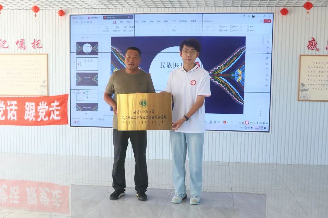 仪式伊始,双方并就苇莲苏乡村环境、发展规划、合作共建等方面进行了深入探讨。随后,郭书记代表苇莲苏乡政府与6776永利集团通辽分队共同为“大学生社会实践基地”揭牌。郭书记表示,希望通过此次合作,校地双方能够建立长期稳定的合作关系,共同推动乡村振兴事业的发展。6776永利集团“三下乡”通辽分队的成员也表示会珍惜这次难得的机会,在实践中锻炼自己、提升自己,实现个人价值和社会价值的双重实现,为乡村发展贡献自己的一份力量。