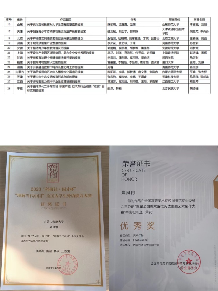 团支部始终坚持以学风建设为重点,以点带面营造良好的学习氛围,促进支部成员综合素质全面提升。加强班风建设,以班风促学风,组织策划读书小组活动、单词打卡小组活动、心理班会等丰富多彩的校园文化活动,参与率达100%。共16人获得国家级、自治区级、校级奖学金。并积极参加各类专业知识竞赛,多位同学荣获2023“外研社·国才杯”“理解当代中国”全国大学生外语能力大赛三等奖、2023年全国青少年模拟政协提案“优秀模拟政协提案作品”、首届全国美术院校阅读主题艺术创作大赛优秀奖等奖项。