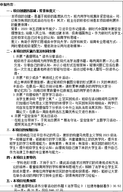 怀揣梦想,肩负责任,2023级法学一班31名同学虽来自五湖四海,但风雨同路将我们紧紧凝结。过去一年,我们牢献身求实团结奋进的校训,以思想建设为龙头,以学风建设为根本,以精品活动为途径,以创建“示范班集体”为目标,努力打造有正气、有才气、有朝气的班集体。。