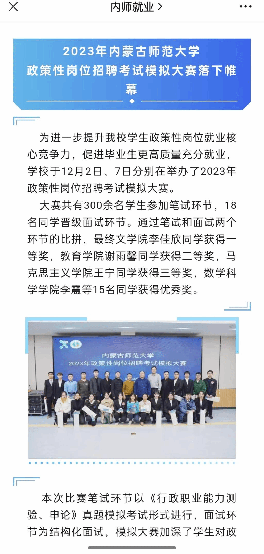 (四)永利官网政策性岗位招聘考试模拟大赛中我班王宁同学荣获校级三等奖
