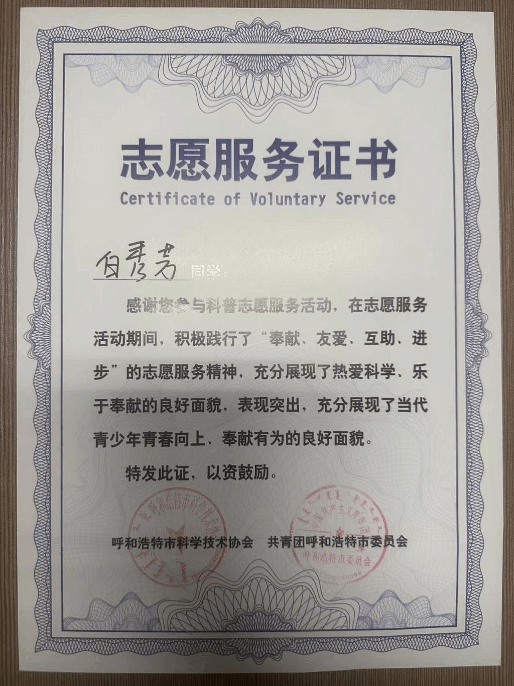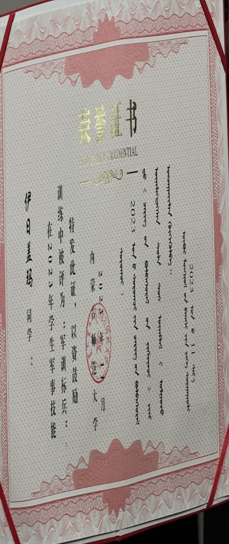 (七)2023级新生在军训中我班杜涓涓和伊日盖玛两名同学荣获"军训标兵"荣誉证书