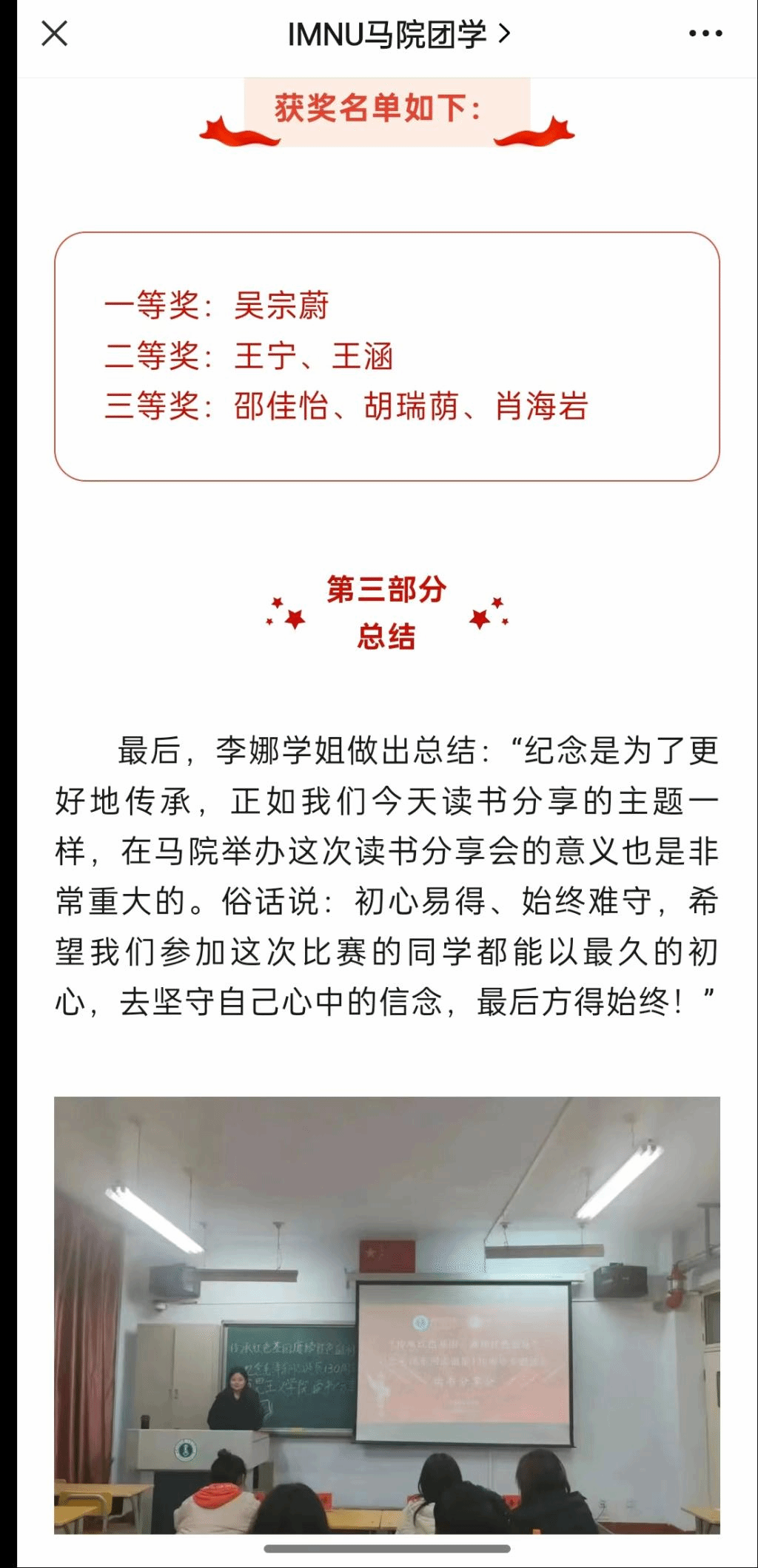 (五)6776永利集团纪念毛泽东诞辰130周年读书分享会中我班王涵和王宁同学荣获院级二等奖