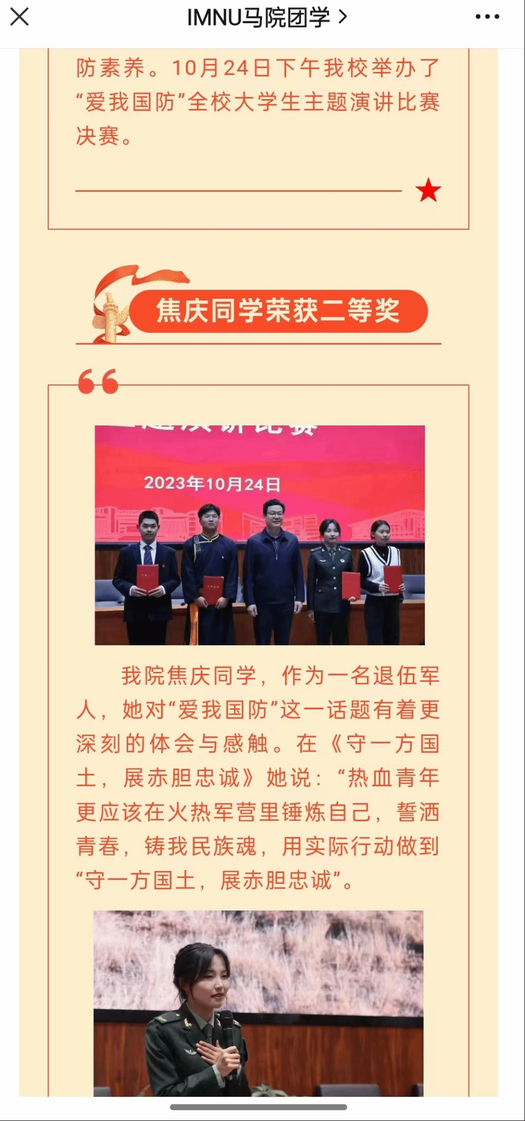(三)永利官网“爱我国防”全校大学生主题演讲决赛中我班焦庆同学荣获校级二等奖,