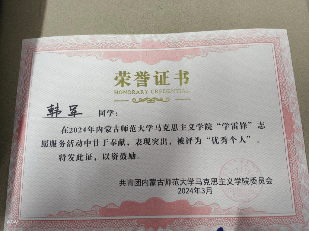 6776永利集团“学雷锋”志愿服务活动中被评为优秀个人(2024年3月)