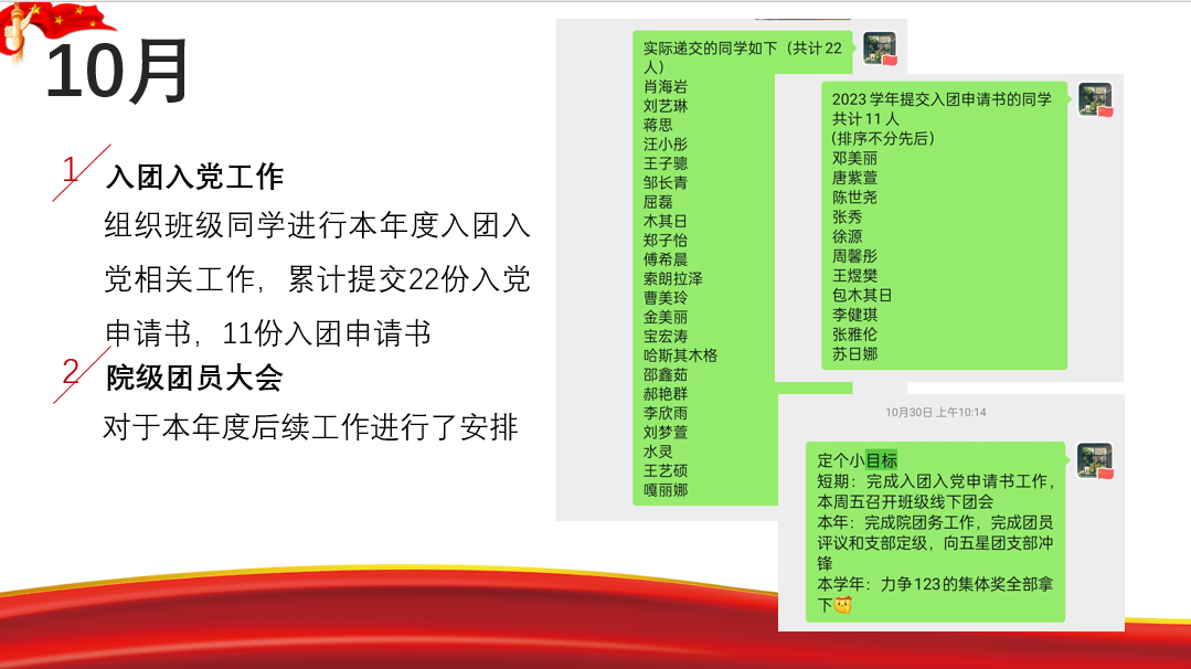 在班级日常学习生活中,班团成员在班委会和团支部的精心组织策划下开展了各种文化活动,如主题班会、团组织生活、阅读交流会等等,在丰富了校园生活的同时,增进同学间的友谊。他们发挥创意,策划了一场场精彩纷呈的表演,展现了自身才艺。通过这些活动,班级凝聚力得到了进一步提升,从而增强集体的凝聚力和向心力,在交流协做中促进自身的全面发展。