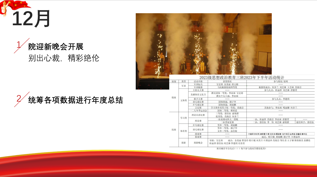 2023级思想政治教育三班立足实践,班级同学齐心协力,班级干部兢兢业业,为班团建设一同出谋划策,在放矢有的中共铸了班级的辉煌。通过各种团队活动,同学们为了集体的利益而努力,从而增强集体的凝聚力和向心力,在交流协做中促进自身的全面发展。