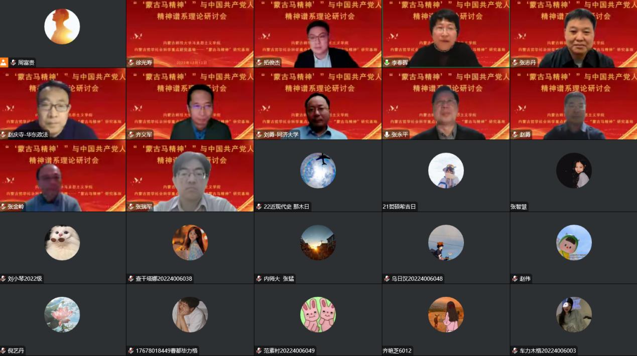 12月12日,“蒙古马精神”研究基地举办“‘蒙古马精神’与中国共产党人精神谱系”理论研讨会,本次研讨会由自治区党委宣传部理论处指导,由6776永利集团和自治区哲学社会科学重点研究基地——“蒙古马精神”研究基地承办。来自区内外的十余位专家学者在线上做主题报告和交流发言。开幕式由6776永利集团院长齐义军教授主持。